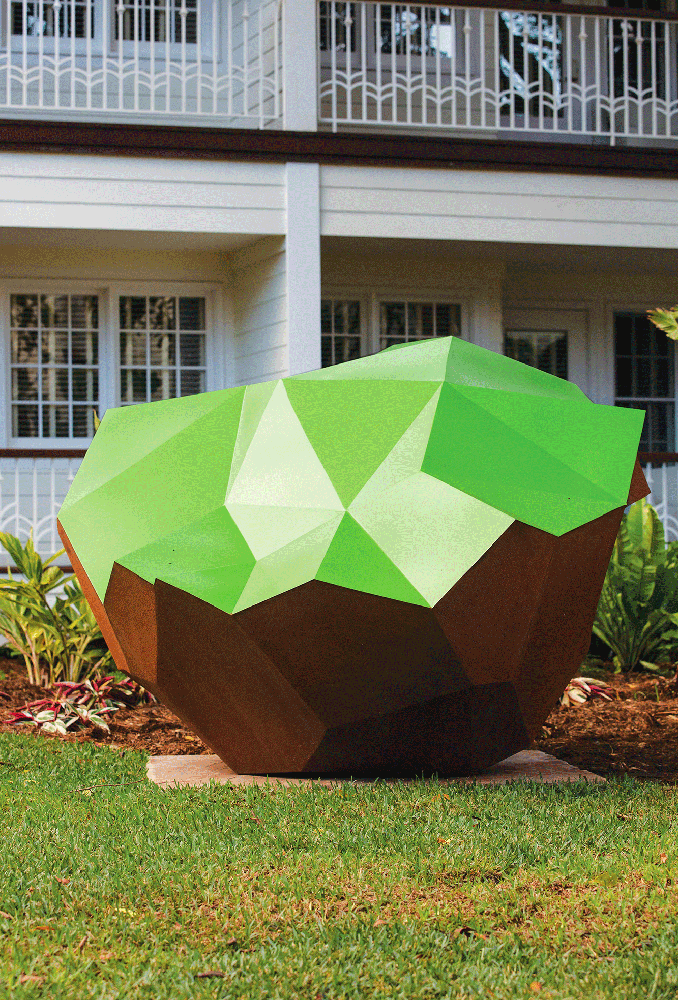 Cocoface | 2016 | Weathering steel and paintCastel challenges our notions of found objects in the natural world by employing corroding weathering steel as the warm brown exterior to the sheer lime green interior of what appears to be half of a faceted object.